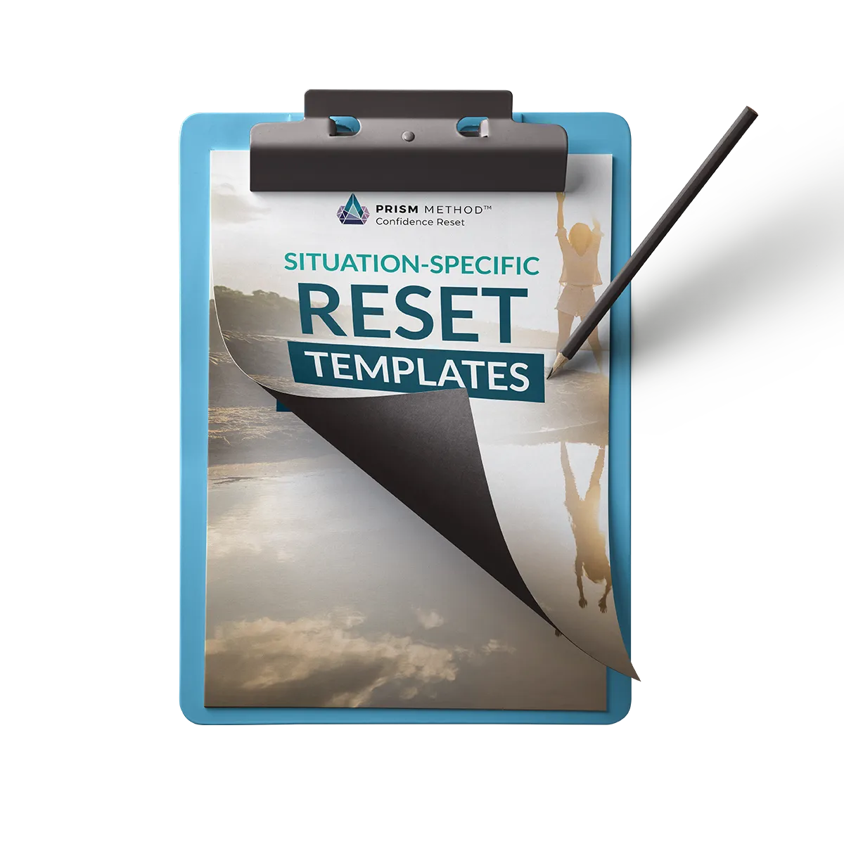 It includes the full 14-day training, daily quick-reference guides, the RESET Tracking Workbook, guided visualizations, situation-specific templates, the Confidence Tracker Journal, and a visual roadmap — everything you need to stop second-guessing and start showing up with confidence at work.