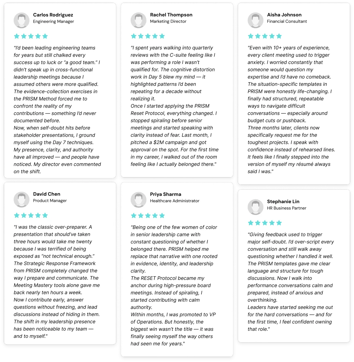 A: Most confidence advice is vague, generic, or built for personal life — not high-stakes professional situations. The PRISM Method™ is designed specifically for the workplace, with tools you can use right away in meetings, presentations, reviews, and tough conversations. It’s not fluff. It’s practical, proven, and built for busy professionals who need results — not pep talks.